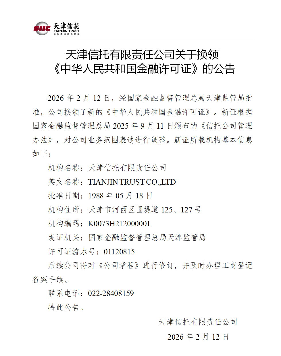 天津信托有限責(zé)任公司關(guān)于換領(lǐng) 《中華人民共和國金融許可證》的公告