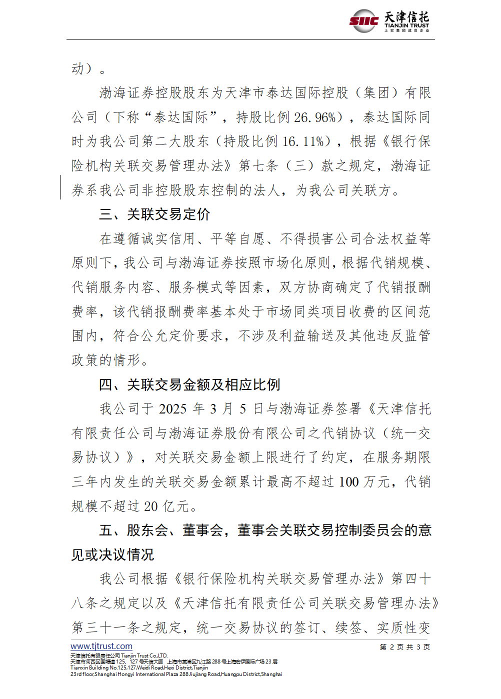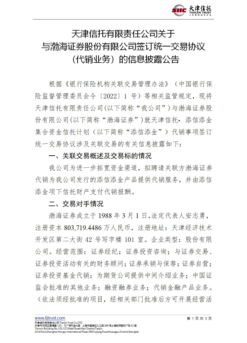 天津信托有限責(zé)任公司關(guān)于 與渤海證券股份有限公司簽訂統(tǒng)一交易協(xié)議 (代銷業(yè)務(wù))的信息披露公告