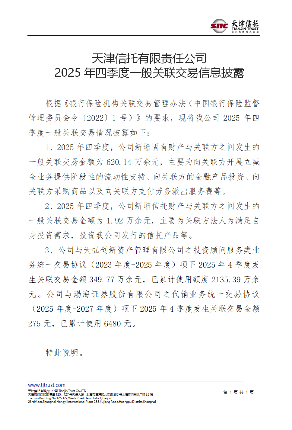 天津信托有限責任公司 2025年四季度一般關(guān)聯(lián)交易信息披露