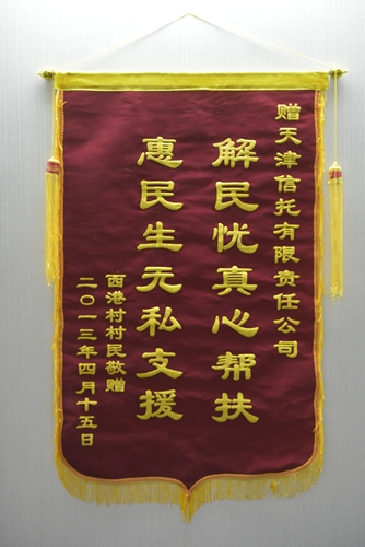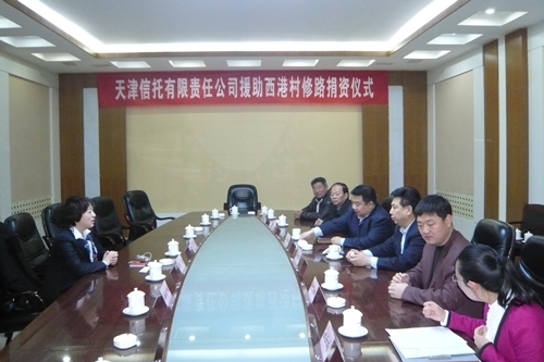 天津信托有限責(zé)任公司響應(yīng)市文明辦號召,與靜海縣西港村開展精神文明“雙百共建”活動,公司出資30萬元援助西港村村街建設(shè)。為了真正給西港村提供實實在在的幫助,公司與村黨支部多次溝通了解需求,并進(jìn)行實地考察確定援助項目,為保證做到資金??顚S?,靜??h委宣傳部、沿莊鎮(zhèn)黨委、西港村和公司四方簽訂項目實施方案,明確工程招標(biāo)、施工監(jiān)督、資金保障等四方的權(quán)利和義務(wù),保證了資金及時到位和??顚S谩D為援助項目實施方案簽字儀式和西港村村民代表送的錦旗。