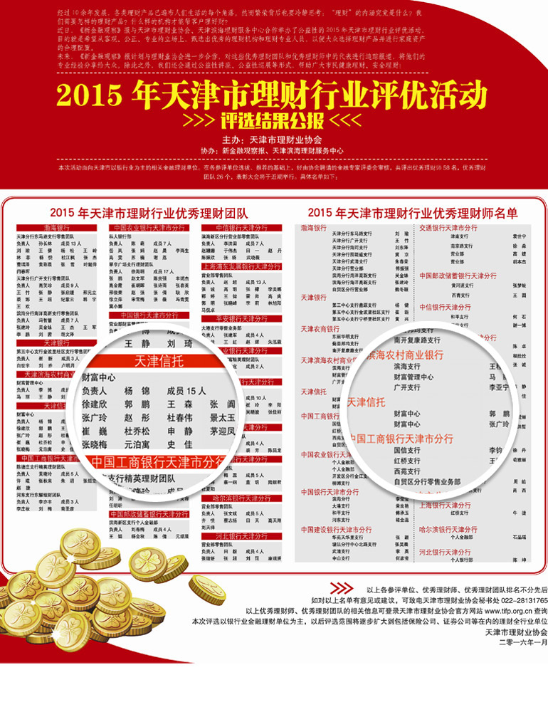 近日,在天津市理財(cái)業(yè)協(xié)會(huì)主辦,《新金融觀(guān)察》報(bào)、天津?yàn)I海理財(cái)服務(wù)中心協(xié)辦的2015年天津市理財(cái)行業(yè)評(píng)優(yōu)活動(dòng)中,我公司財(cái)富中心榮獲“2015年天津市理財(cái)行業(yè)優(yōu)秀理財(cái)團(tuán)隊(duì)”稱(chēng)號(hào),財(cái)富中心的張廣玲、郭鵬兩位理財(cái)經(jīng)理被評(píng)為“2015年天津市理財(cái)行業(yè)優(yōu)秀理財(cái)師”。