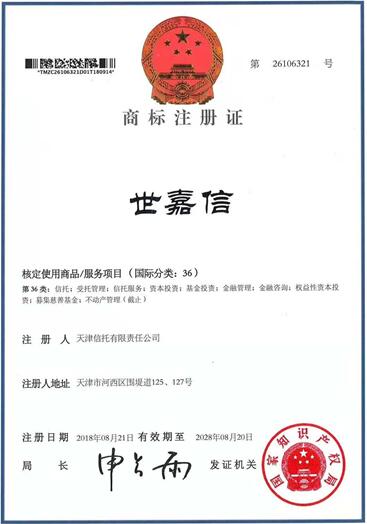 “世嘉”諧音“世家”、“事佳”,寓意“世代傳承,永續(xù)美好”;“信”取其“信誠與信任”之意,亦為天津信托家族信托系列產品核心詞。申請“世嘉·信”注冊商標,并以其為天津信托系列家族信托產品命名,代表了天津信托將以信為本,誠信經(jīng)營,以專業(yè)管理水平幫助家族信托委托人實現(xiàn)“財富傳承、基業(yè)恒青”的初衷、信心與決心。