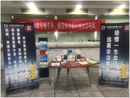 根據(jù)中國銀保監(jiān)會的安排部署,天津信托于5月開展了2019年防范非法集資宣傳月活動。此次活動以“攜手筑網(wǎng)、網(wǎng)防共治”為主題,以“提升金融消費(fèi)者識別和防范非法集資的能力”為目標(biāo)。在宣傳教育中,我們重點向公眾進(jìn)行相關(guān)法律政策的解讀,指導(dǎo)公眾明辨正規(guī)的金融服務(wù)同時向公眾進(jìn)行風(fēng)險提示,使其提高警惕性,消除僥幸心理,將“高收益必然伴隨高風(fēng)險”、“參與非法集資風(fēng)險自擔(dān)”的理念深入人心。