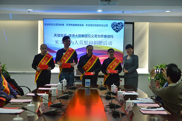 2019年12月4日,天津市見義勇為協(xié)會(huì)、天津市福老基金會(huì)與天津信托有限責(zé)任公司聯(lián)合舉辦見義勇為人員慰問捐助活動(dòng),“天信世嘉·信德大田集團(tuán)見義勇為慈善信托”向我市十二位見義勇為先進(jìn)代表頒發(fā)慰問捐助金5萬元,兩位受捐助見義勇為人員代表在捐贈(zèng)儀式上介紹了自己的英雄事跡。