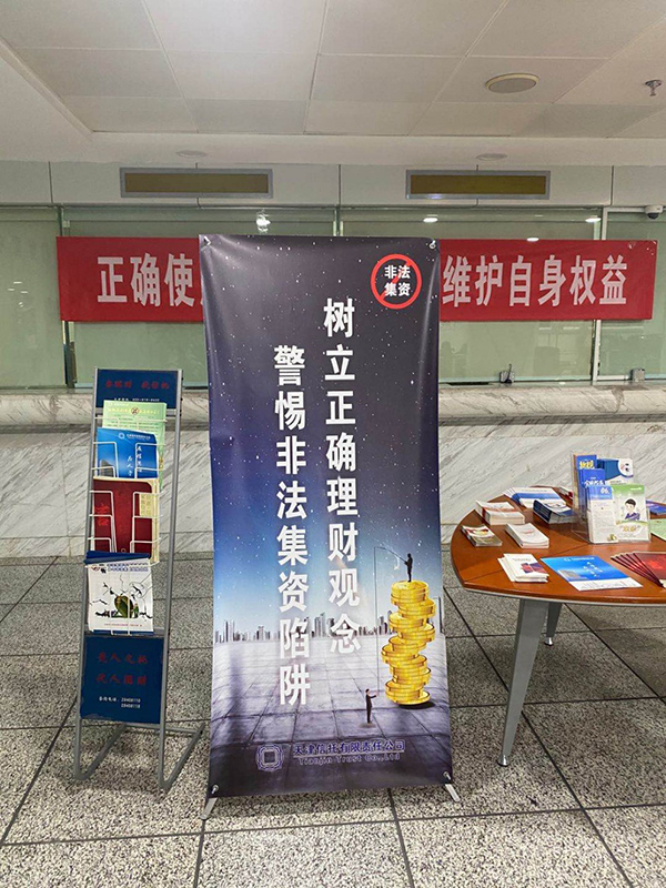 宣傳教育活動(dòng)期間,公司通過多種線上、線下的宣傳形式開展宣傳教育。在營(yíng)業(yè)大廳里,懸掛橫幅,張貼宣傳海報(bào);在宣傳臺(tái)上,擺放了公司自行設(shè)計(jì)的知識(shí)手冊(cè),供客戶選讀;在微信平臺(tái)上,公司設(shè)置防范非法集資宣傳專題,刊登相關(guān)文章;在與客戶的日常交流中,積極向客戶宣傳防范非法集資的相關(guān)知識(shí),講解近期發(fā)生的非法集資案例以及相關(guān)基礎(chǔ)金融知識(shí)。