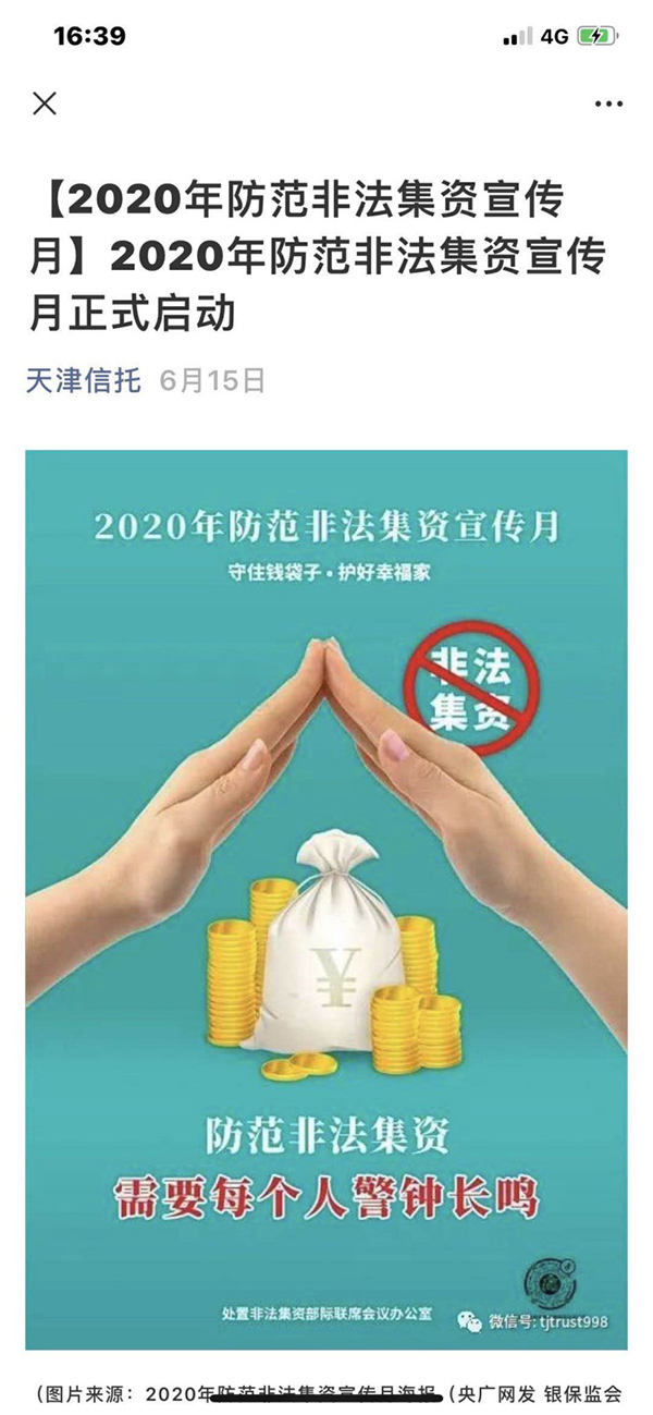 根據(jù)天津銀保監(jiān)局的部署和要求,天津信托于6月開展防范非法集資宣傳教育工作?;顒?dòng)以“守住錢袋子、護(hù)好幸福家”為主題,以提升社會(huì)公眾金融素養(yǎng)和風(fēng)險(xiǎn)防范意識(shí)為目標(biāo),通過對(duì)金融消費(fèi)者進(jìn)行宣傳教育,揭示非法集資的特征和危害,教育群眾自覺遠(yuǎn)離涉非風(fēng)險(xiǎn),提高公眾的金融認(rèn)知水平,共同守護(hù)美好生活。
