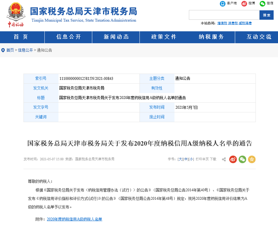 近日,國家稅務總局天津市稅務局網(wǎng)站公布了2020年度納稅信用評價結果,我公司已連續(xù)第9年被評為A級納稅人。