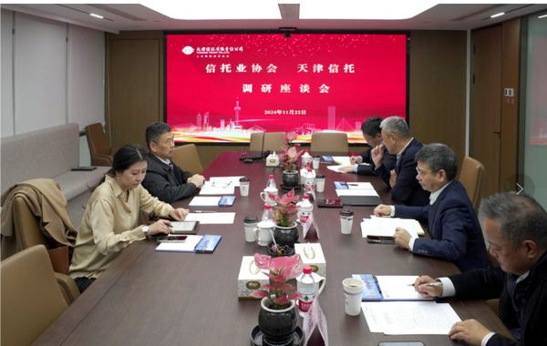 2024年11月24日上午,中國信托業(yè)協(xié)會黨委書記、專職副會長(常務(wù))劉峰,會員維權(quán)與服務(wù)部副主任孫琳一行來天津信托調(diào)研座談。天津信托黨委書記、董事長周雄主持座談會,總經(jīng)理黎代福,常務(wù)副總經(jīng)理(擬任)梁俊雄,業(yè)務(wù)總監(jiān)楊海軍等參加調(diào)研。