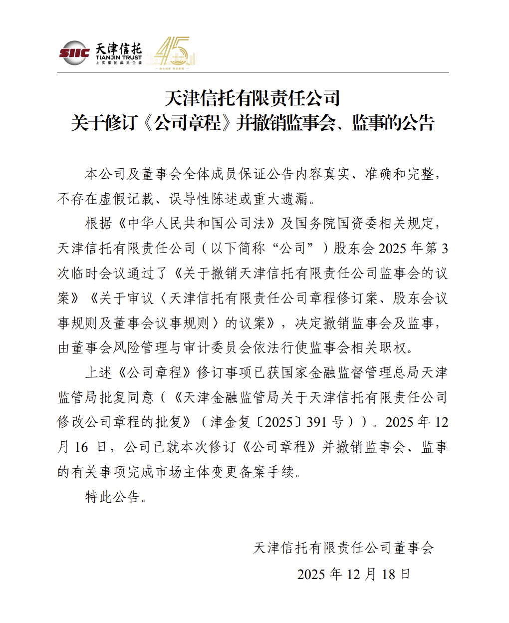 天津信托有限責(zé)任公司關(guān)于修改《公司章程》并撤銷監(jiān)事會、監(jiān)事的公告