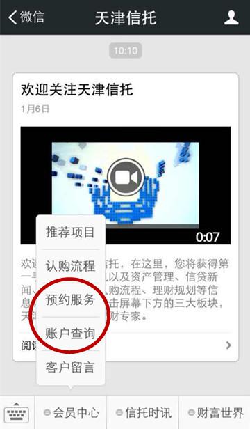 為方便廣大客戶,我公司微信公眾平臺(tái)的“預(yù)約服務(wù)”和“賬戶查詢”功能已于近日正式上線!這兩項(xiàng)功能的開(kāi)通,將可以使廣大客戶以更加便捷的方式進(jìn)行新推項(xiàng)目的預(yù)約、查詢存續(xù)項(xiàng)目的投資資金情況。